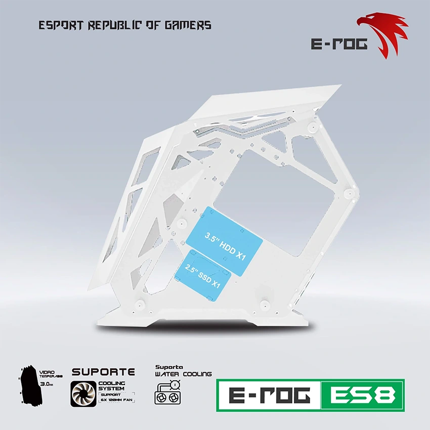 ES8 với các đặc trưng khung vỏ thiết kế mở sử dụng CNT thủ công CNC & NCT cho chi tiết chính xác để khi lắp các thành phần cấu kiện máy tính vào chuẩn nhất. Chất liệu bộ khung ES8, sử dụng vật liệu chất lượng hàng đầu có độ dày 1 – 0,8mm với bề mặt màu xám kim loại trang nhã 2 mặt bên slide A và slide B trang bị kính cường lực.